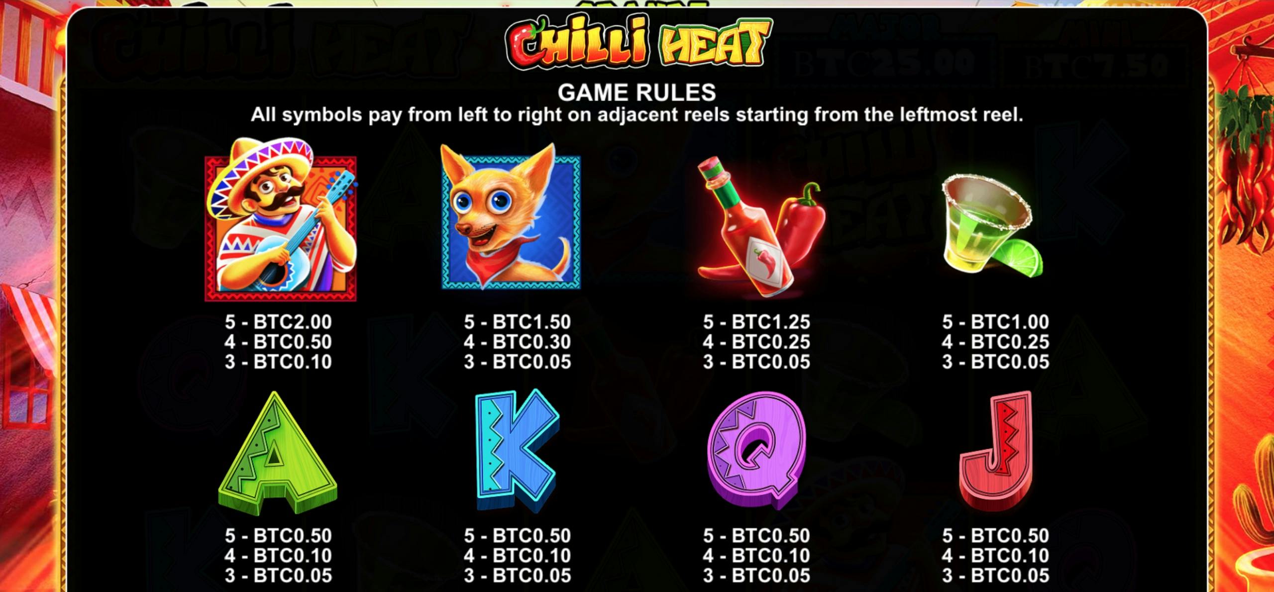Chilli Heat bitcoin slot offers a progressive jackpot that is fun to get and exciting to play. Dance to the music as the band plays while pressing that spin button loyally. Have a great time from afternoon till night and let the heat flow through you!