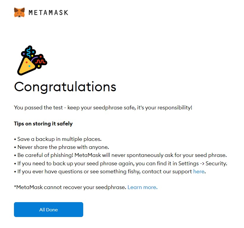 - Este es el paso más importante. Haga una copia de seguridad de su frase secreta. No guarde su frase secreta en su ordenador, ni en su teléfono, ni en NINGÚN lugar digital. La frase secreta de recuperación es la única forma de acceder a tu monedero si olvidas tu contraseña. Cualquier persona con esta frase secreta de recuperación puede acceder a su monedero desde cualquier ordenador, en cualquier lugar del mundo. Escriba la frase secreta de recuperación físicamente y guárdela en un lugar seguro.