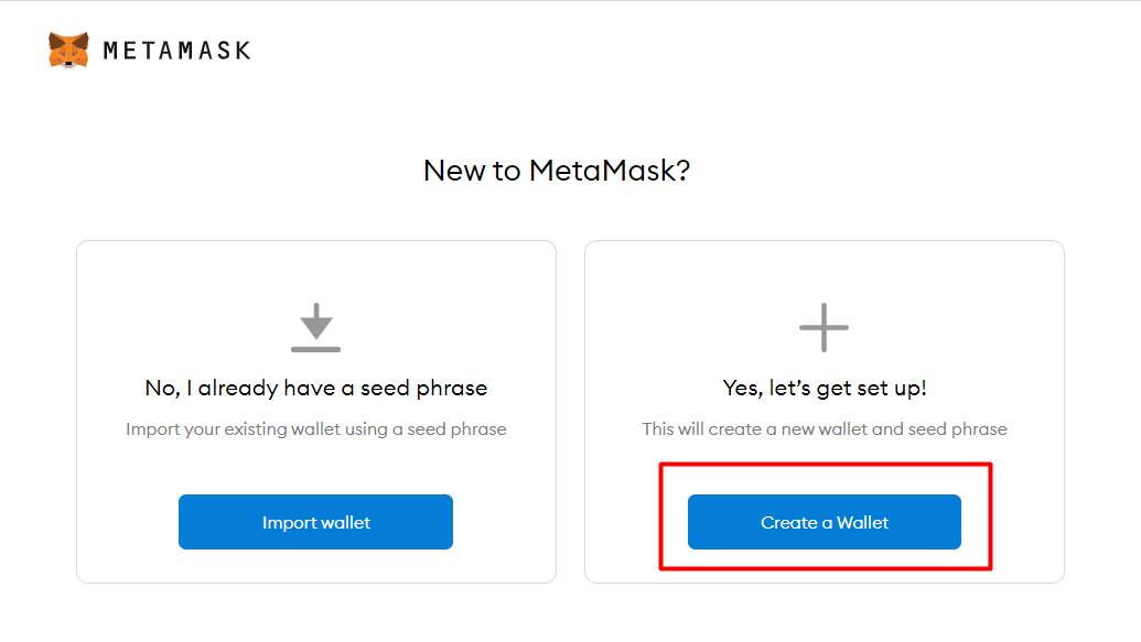 - If this is your first time creating a wallet, click the Create a Wallet button. (If you already have a secret recovery phrase for an already existing Metamask wallet, import the already created wallet using the Import Wallet button).