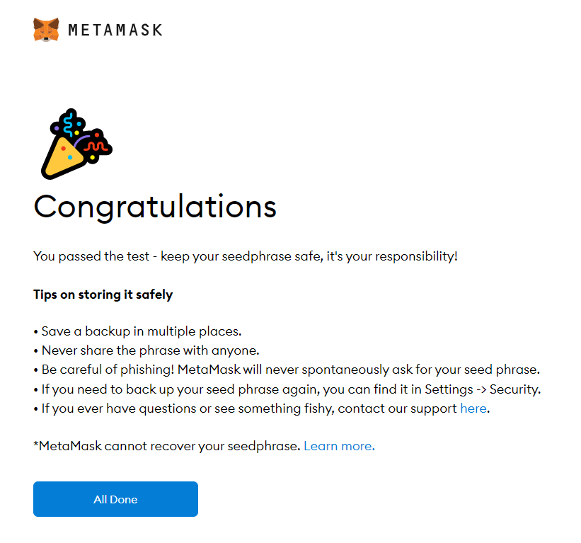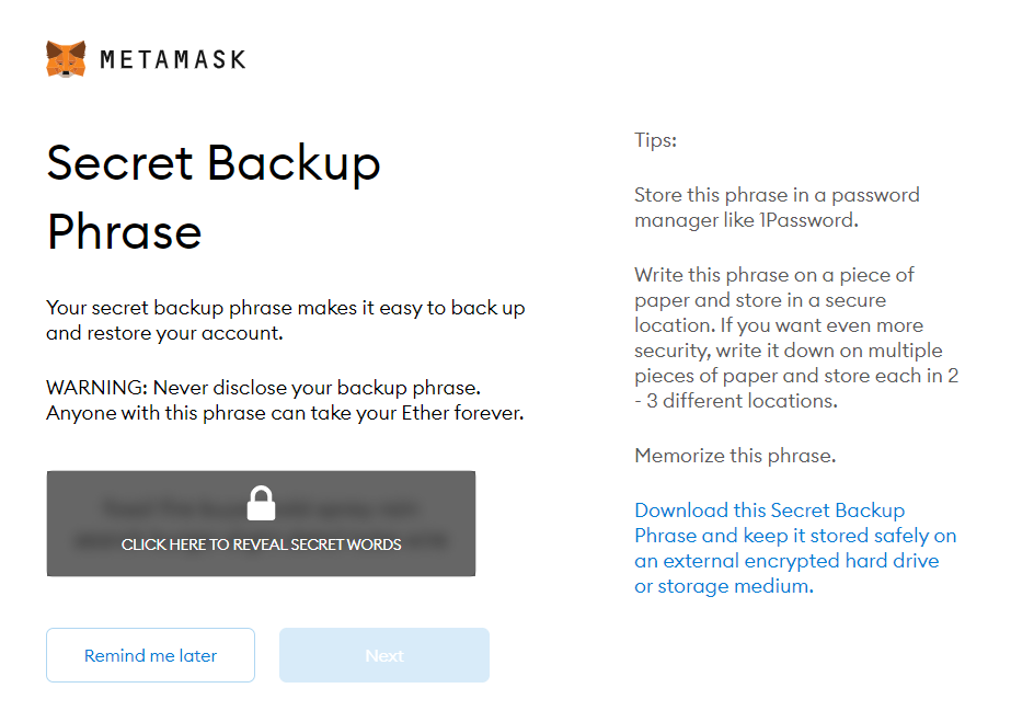 - This is the most important step. Back up your secret phrase properly. Do not store your secret phrase on your computer, or your phone, or ANYWHERE digitally. The secret recovery phrase is the only way to access your wallet if you forget your password. Anyone with this secret recovery phrase can access your wallet from any computer, anywhere in the world. Write the secret recovery phrase down physically, and store it in a safe place.