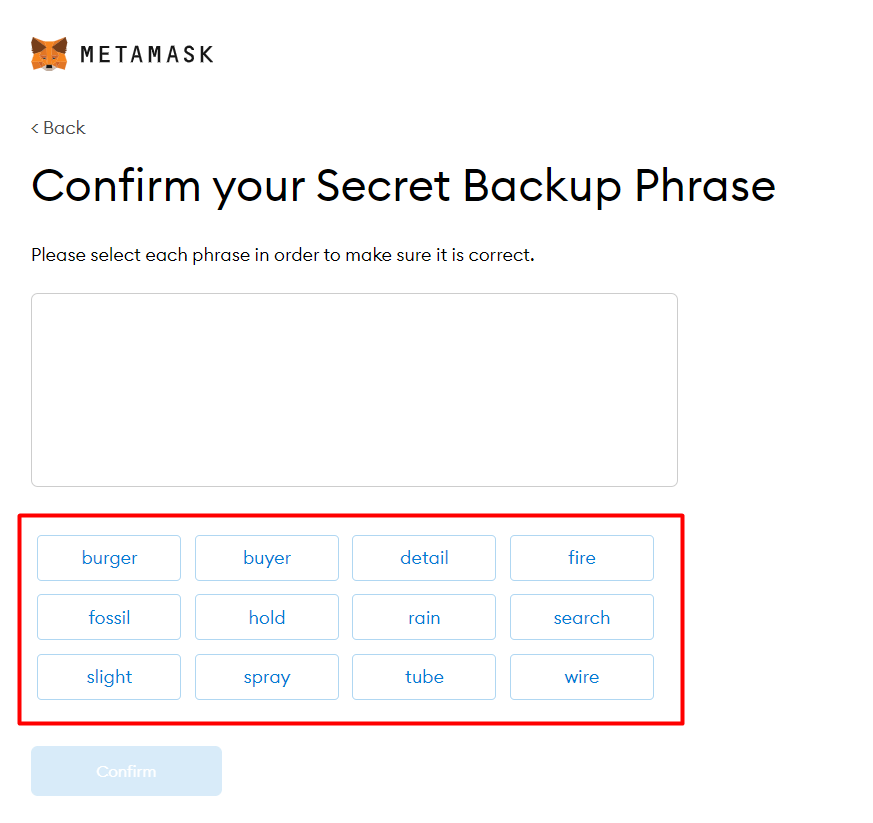 - Click the buttons respective to the order of the words in your secret recovery phrase. In other words, type the seed phrase using the button on the screen. If done correctly the Confirm button should turn blue.Â