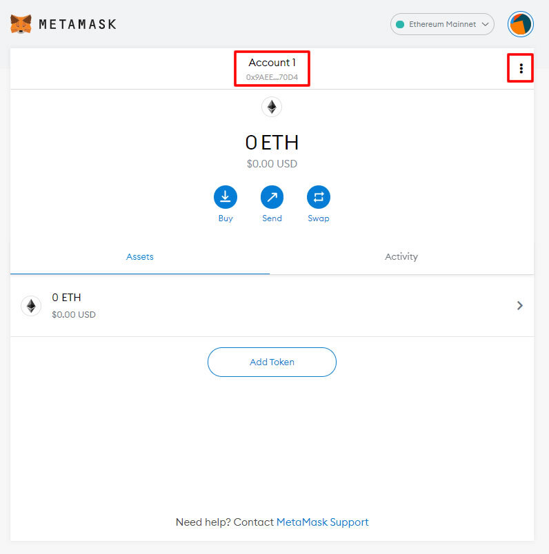 - You can see the balance and copy the address of the account by clicking on the Account 1 area. You can also rename the Account by clicking the menu button.Â
