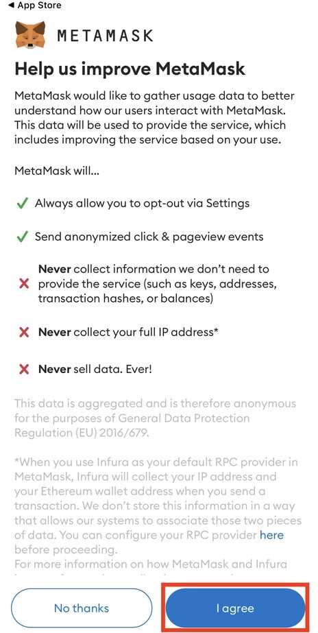 - Tap on I Agree button to allow data to be collected to help improve Metamask or else tap the No Thanks button.