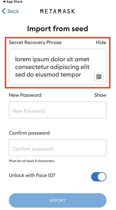 - Insert your secret recovery phrase (the 12 words you saved in step 7 of Metamask Installation). You can tap on Show to see your input.Â