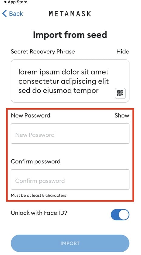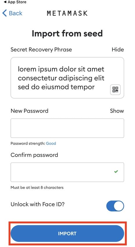 - Tap IMPORT and the wallet you've set up on your computer will be visible on the Metamask app.