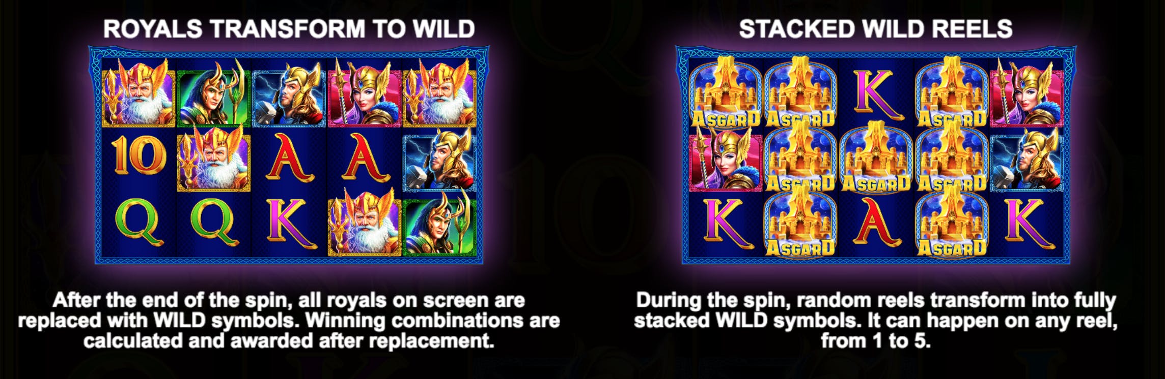 Asgard tem muitas características únicas, incluindo o Doubling Golden Wild que duplica todas as vitórias. O Doubling Golden Wild substitui os símbolos próximos a ele, completando assim uma combinação vencedora (excluindo o scatter). Se os jogadores conseguirem cinco scatters, terão um impressionante ganho de 1.250 vezes, enquanto os multiplicadores durante os giros grátis podem disparar até 5 vezes!